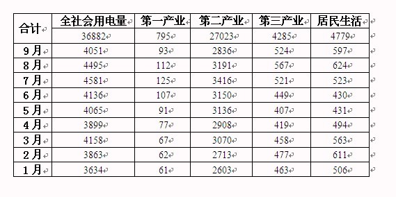 2012年1-9月我國全社會用電情況
